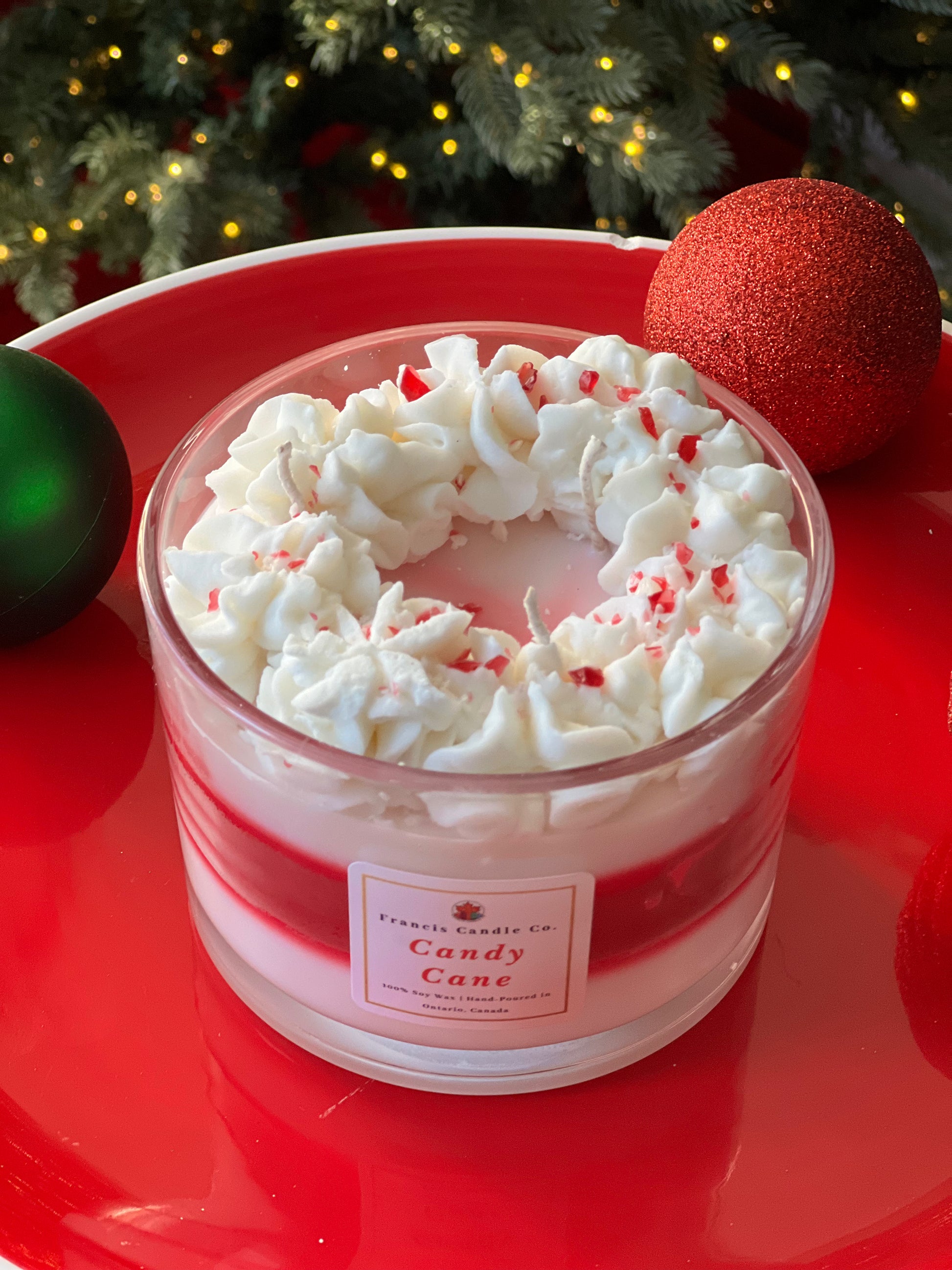 Indulge in the holiday spirit with our traditional candy cane soy wax candle. Made with layers of red and white wax and topped with whipped soy wax and crushed candy cane, it will fill your home with the festive scents of peppermint and vanilla sugar.