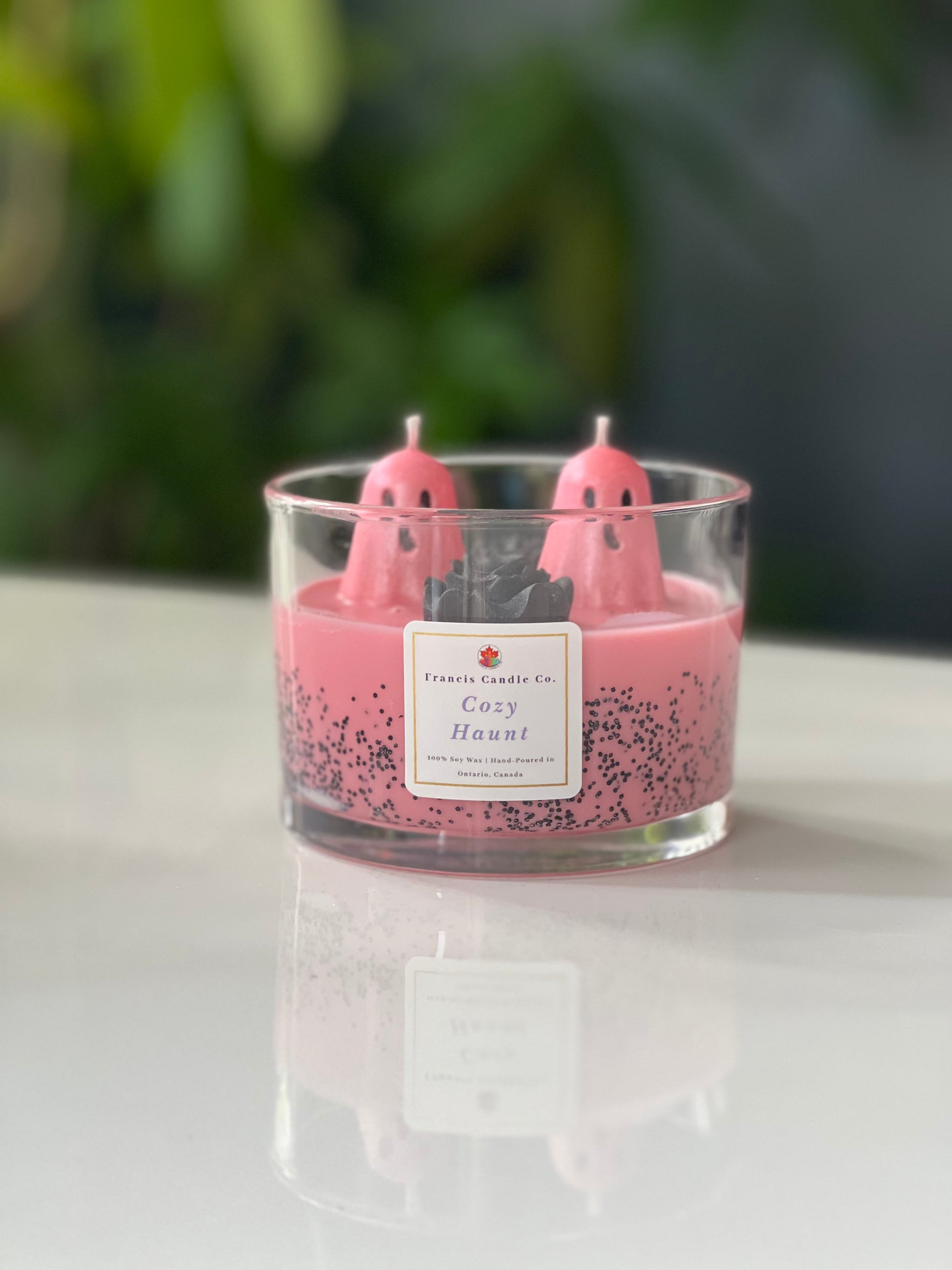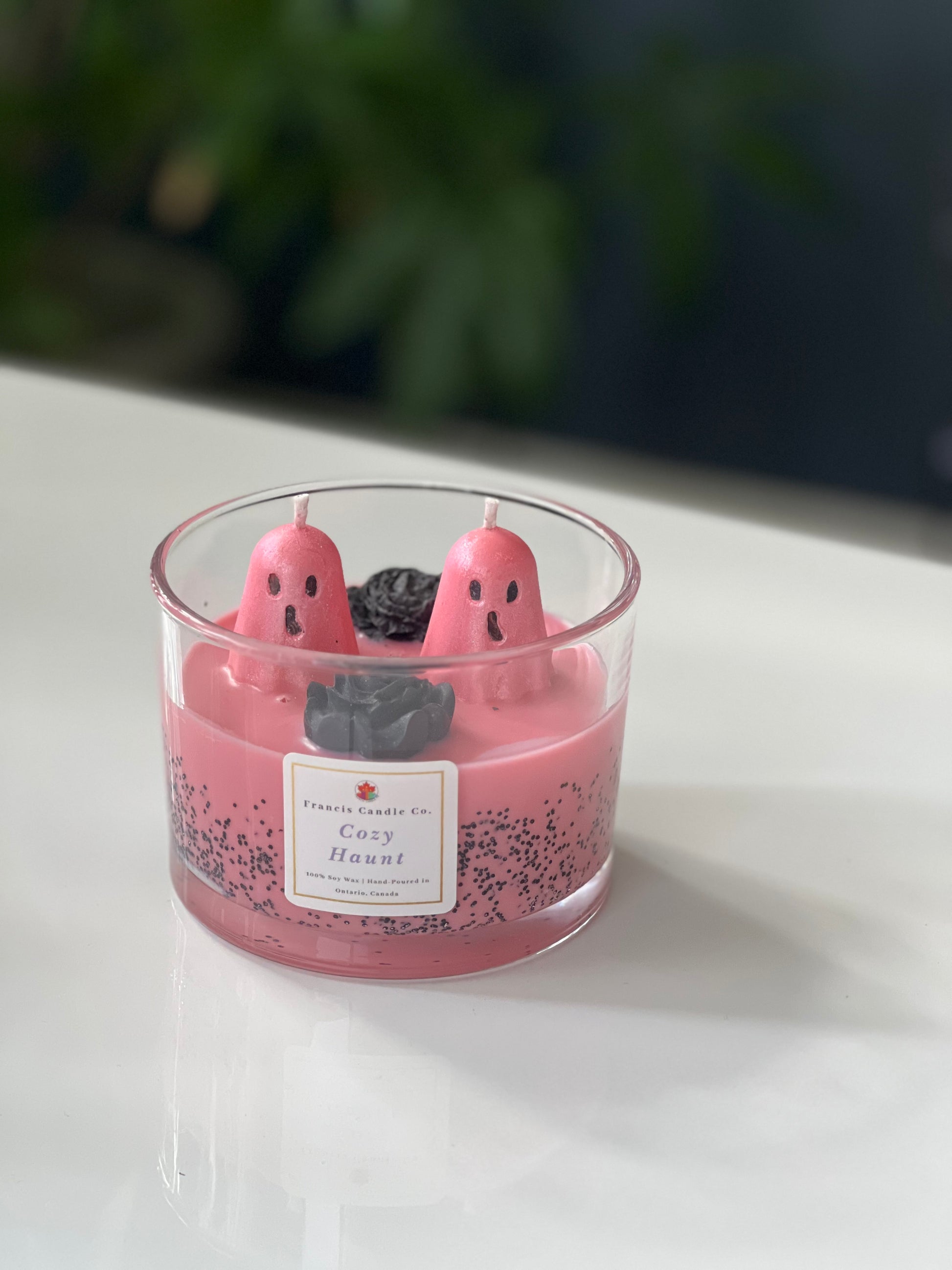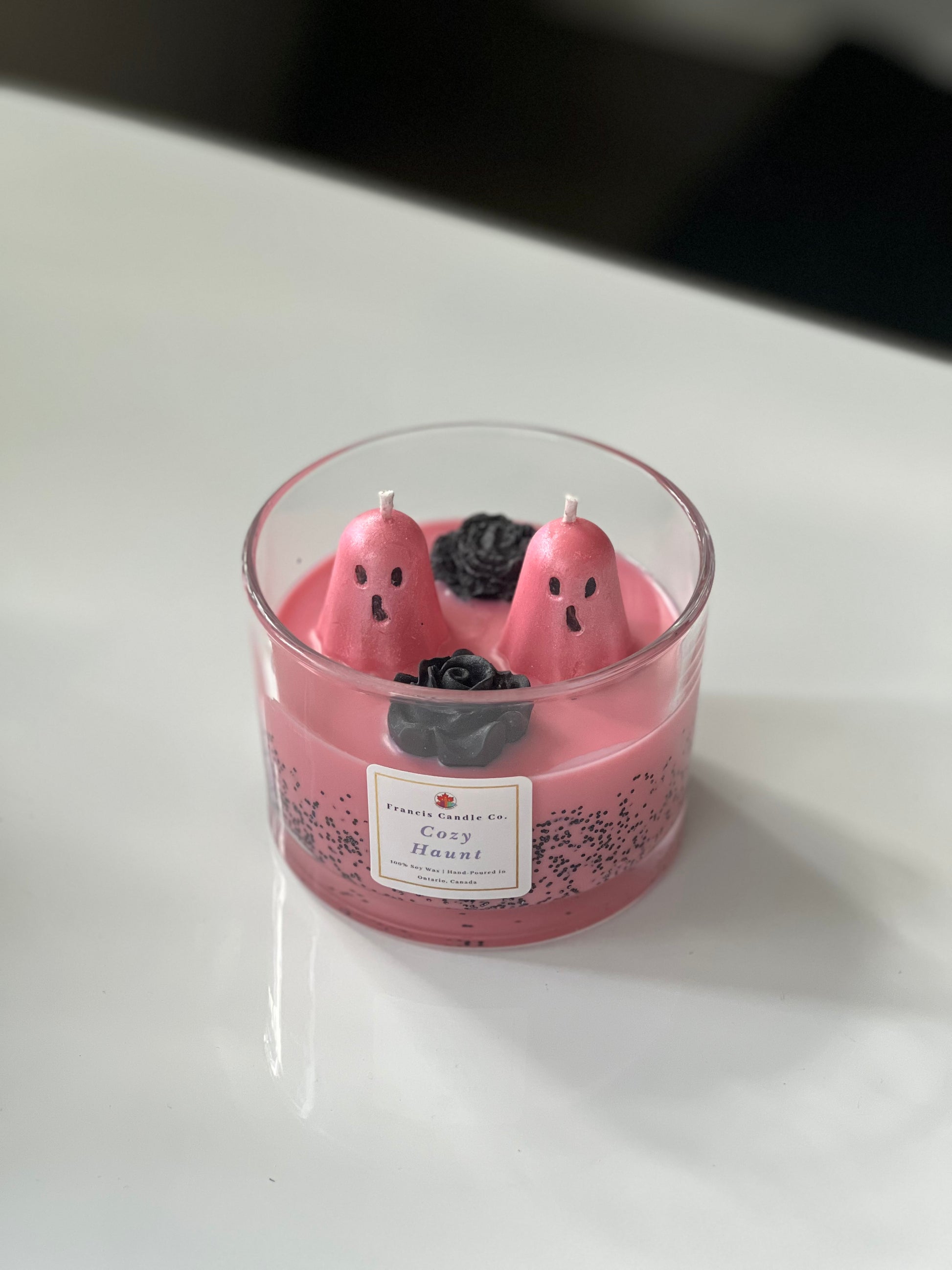 Transform your home into a cozy haunt with our hand-poured soy wax candle. The warm, inviting scent will create a hauntingly beautiful ambiance while the shimmery pink ghost adds a touch of whimsy. Each candle includes black roses, the perfect finishing touch to this ghostly delight.