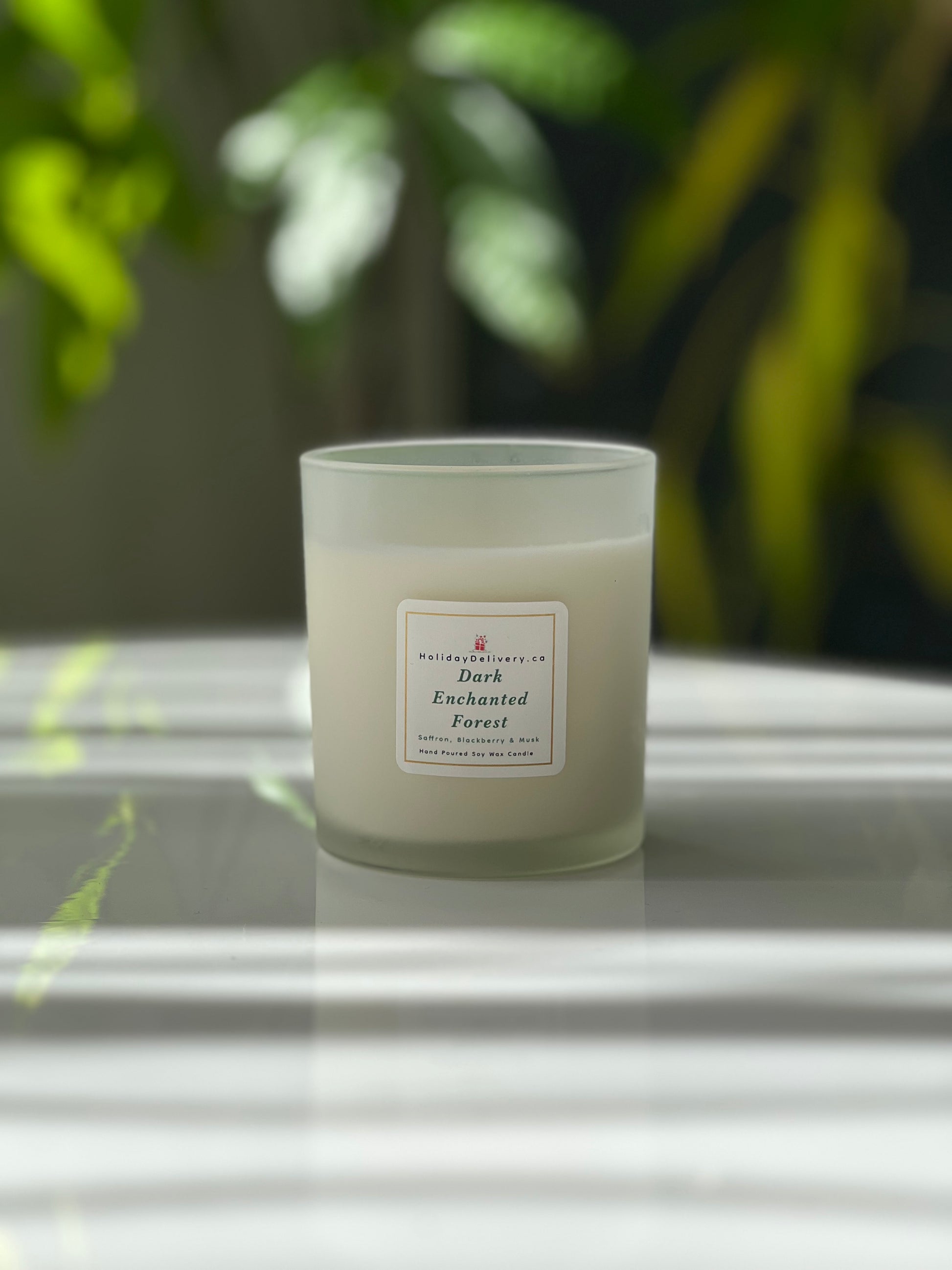 Take a walk through a lush and dark enchanted forest. This unique candle blend has top notes of eucalyptus, saffron, middle notes of blackberry and base notes of musk and amber.