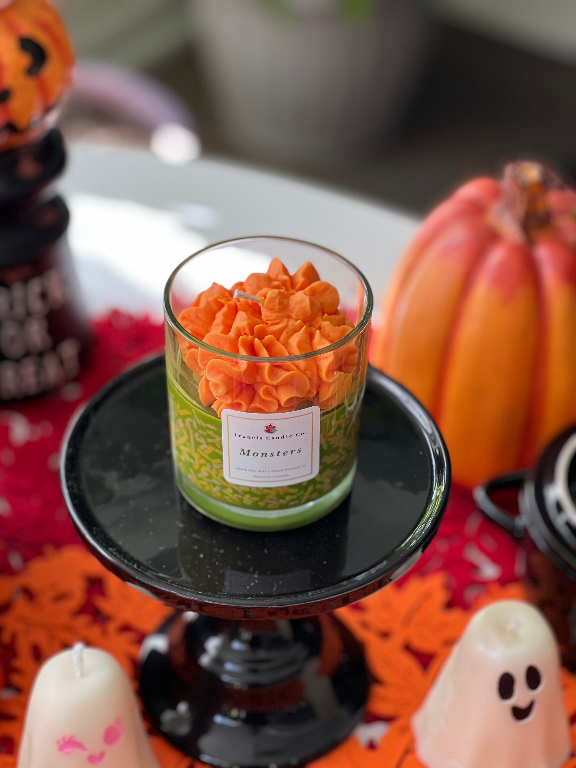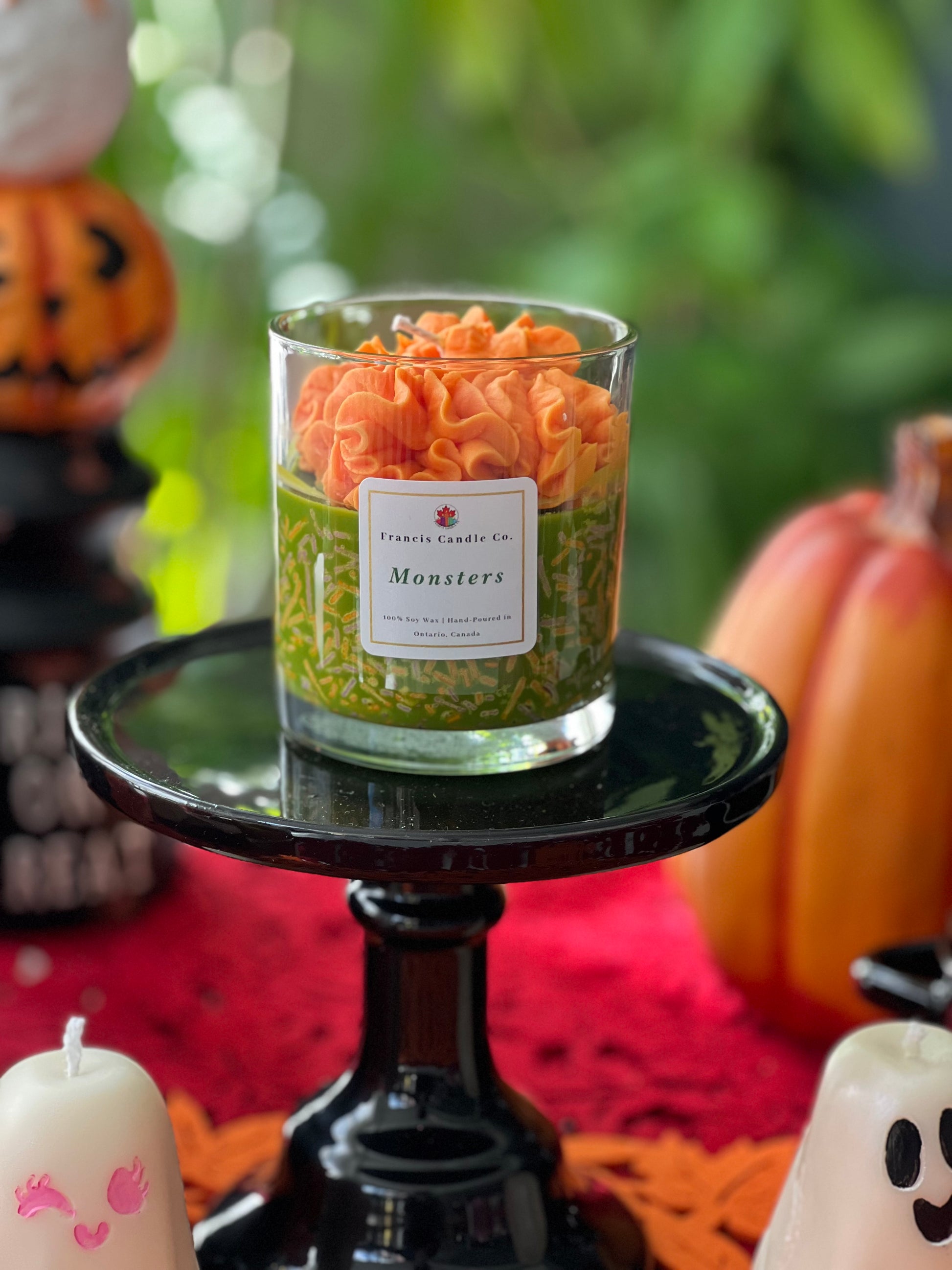 A spooky and quirky addition to our fall collection, Monsters soy wax candle is scented with teakwood and mahogany. each candle has a sprinkled side and is finished with an orange whipped soy wax.