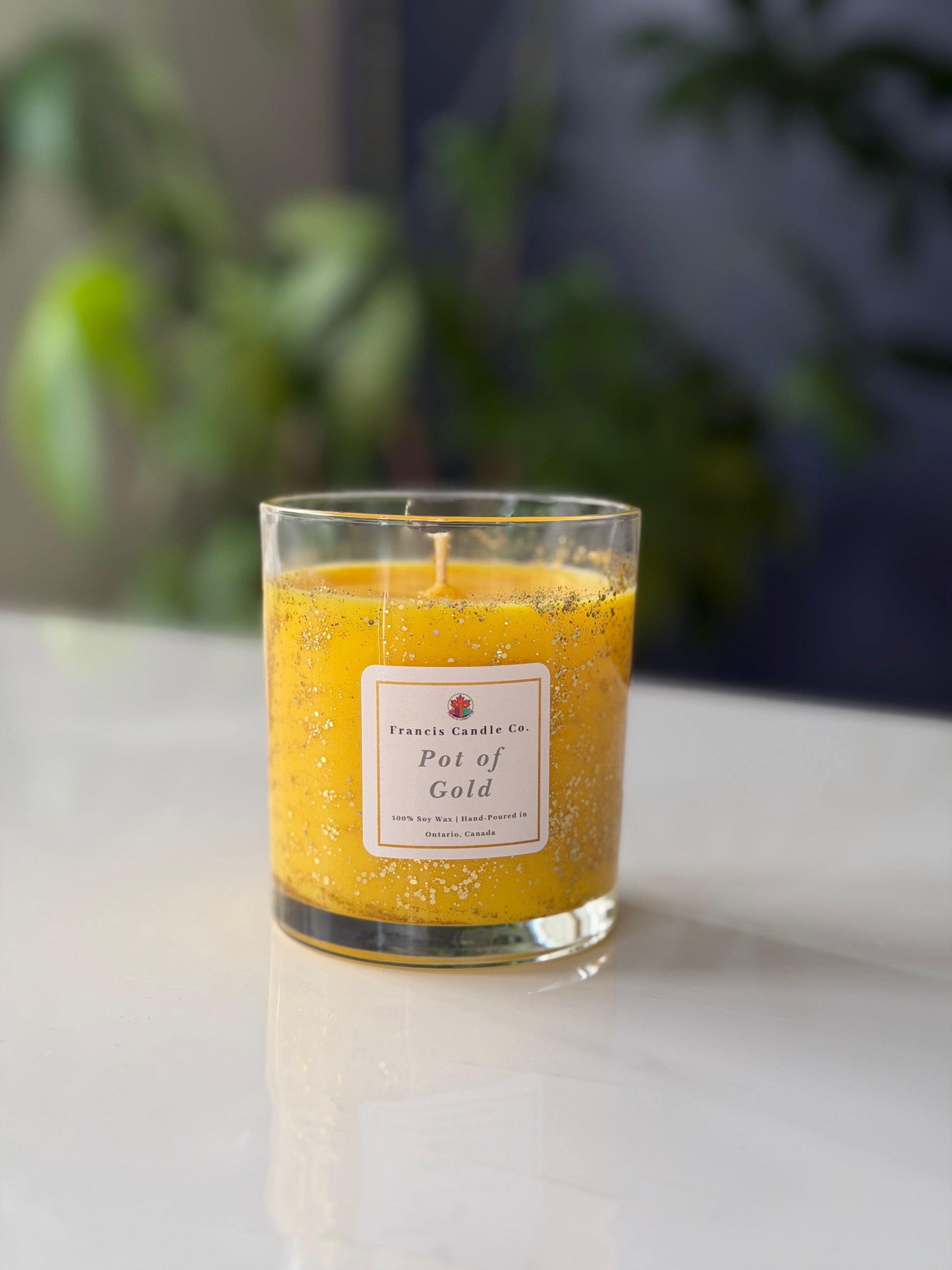 Pot of Gold is a nod to St. Patrick’s Day. Scented with light and sweet champagne, coloured in yellow and hand painted with a gold finish.